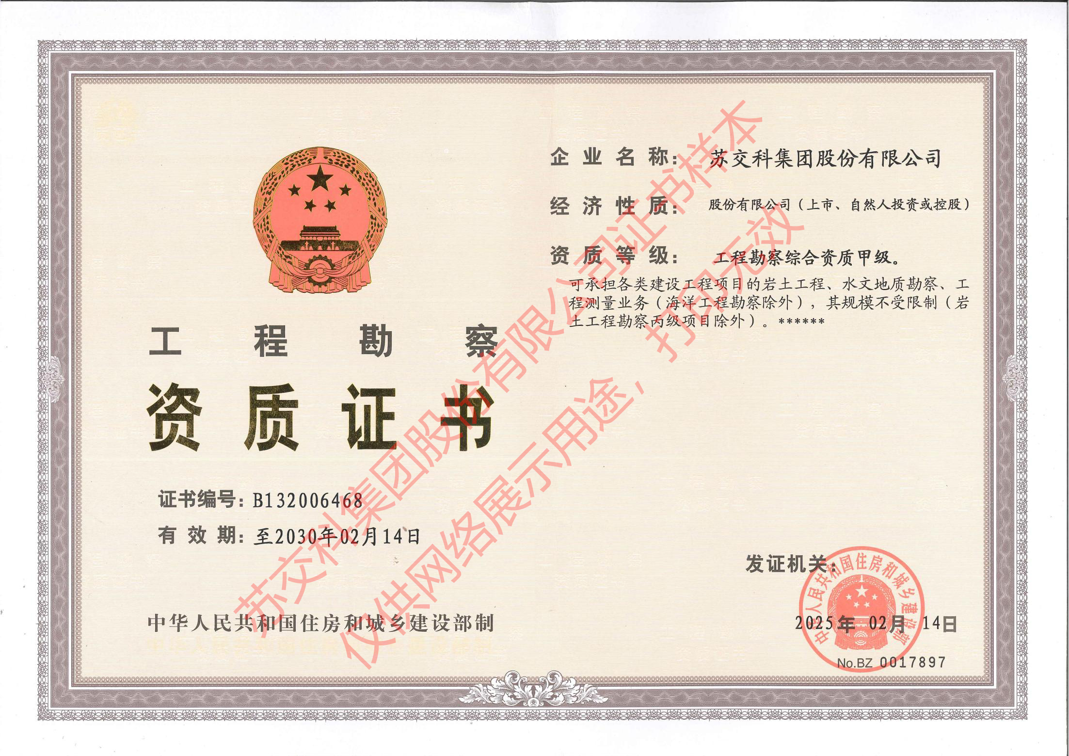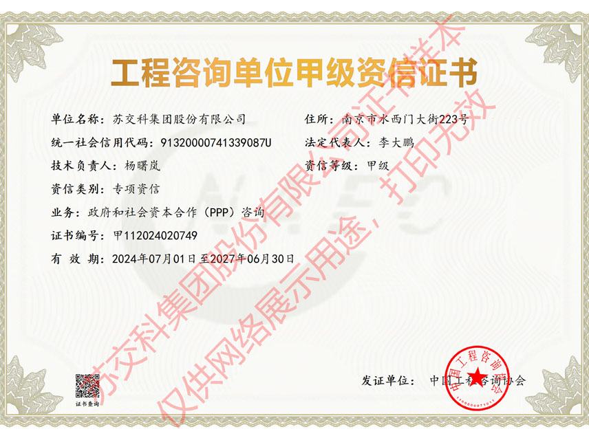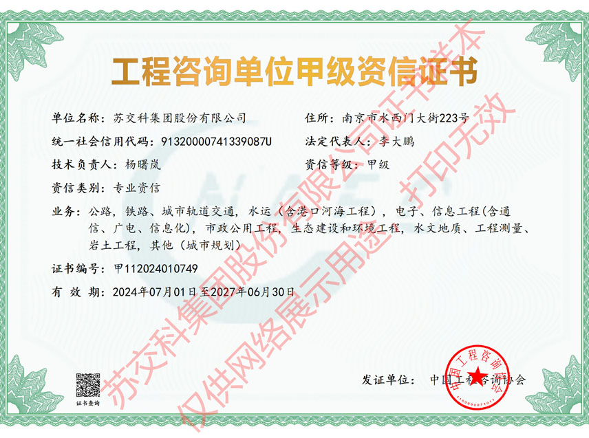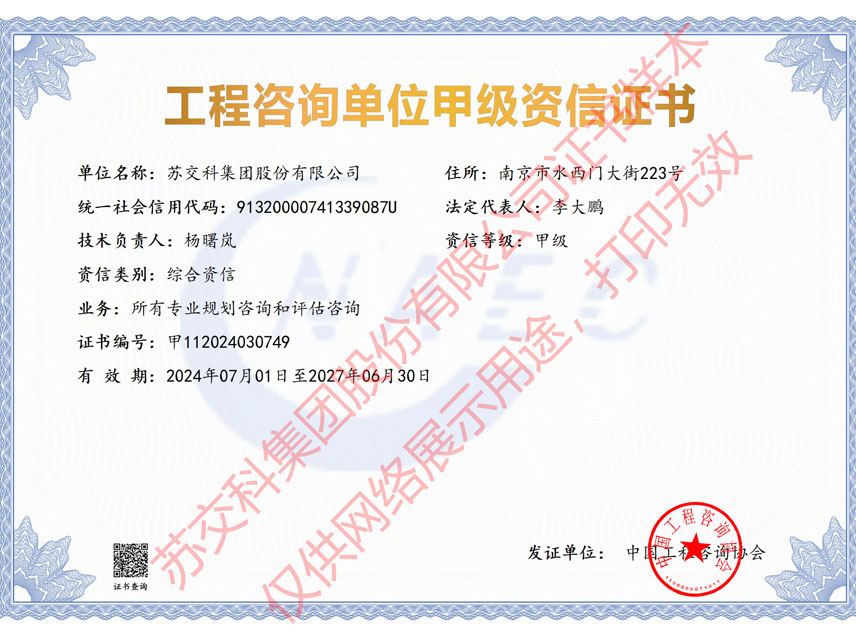 集團資質蘇交科擁有工程行業(yè)各領域甲級資質,包括城鄉(xiāng)規(guī)劃甲級資質;工程咨詢綜合甲級資質;工程咨詢專業(yè)甲級資質(公路、生態(tài)建設和環(huán)境工程、水文地質、工程測量、巖土工程、城市規(guī)劃、鐵路、城市軌道交通、港口河海工程、市政公用工程(市政交通、給排水)、水利工程、旅游工程);工程設計綜合甲級資質;工程勘察綜合類甲級資質;測繪甲級資質;公路工程和市政公用工程總承包一級資質;公路工程、水運工程、市政公用工程監(jiān)理甲級資質;公路工程甲級、公路工程交通工程專項、水運工程材料甲級和水運工程結構甲級試驗檢測資質。